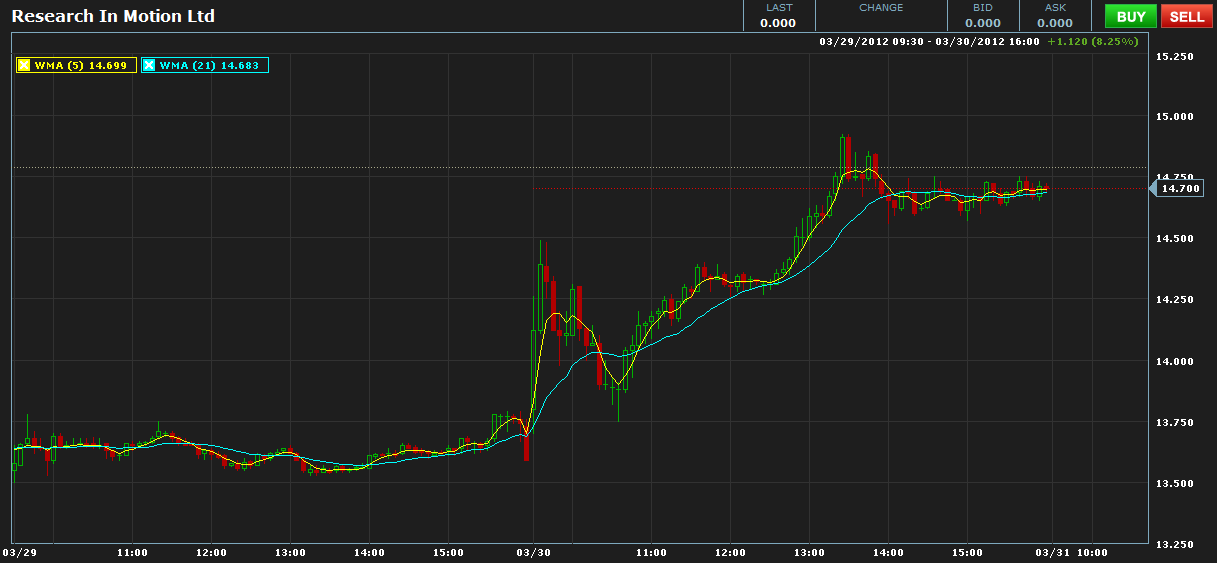 This where the RIMM 14c Apr came into play. One of the members in the SangLucci Weekly Option room, we talked about if RIMM was able to hold $13.80 per share if could see $14.50 at least for the intra-day trading. Wild card is if you wanted a "Lotto Play" then RIMM 14c Mar Qtr would have done the trick.